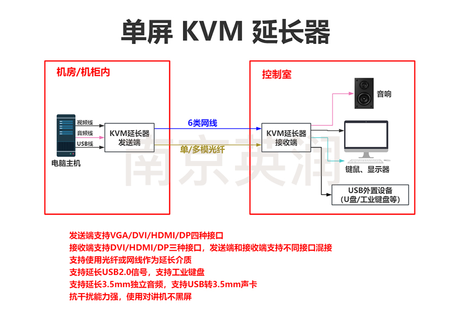 KVM延长器,即延长电脑主机的键盘、鼠标、显示器等信号到远端,方便在远端对电脑的操作和监控,常用于指挥控制室等场所。